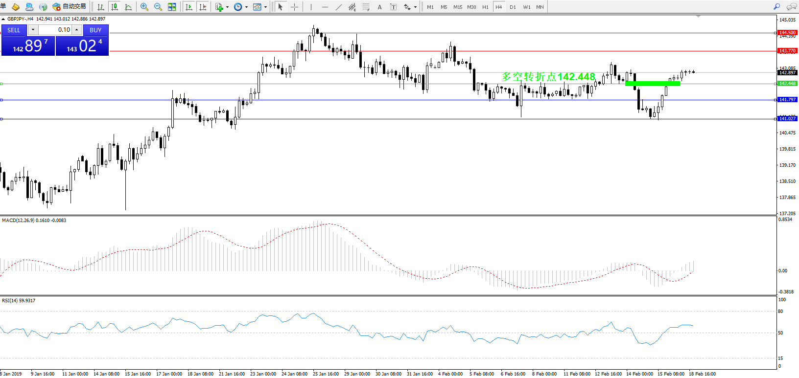 交易策略:142.448上方看涨,目标143.770144.500