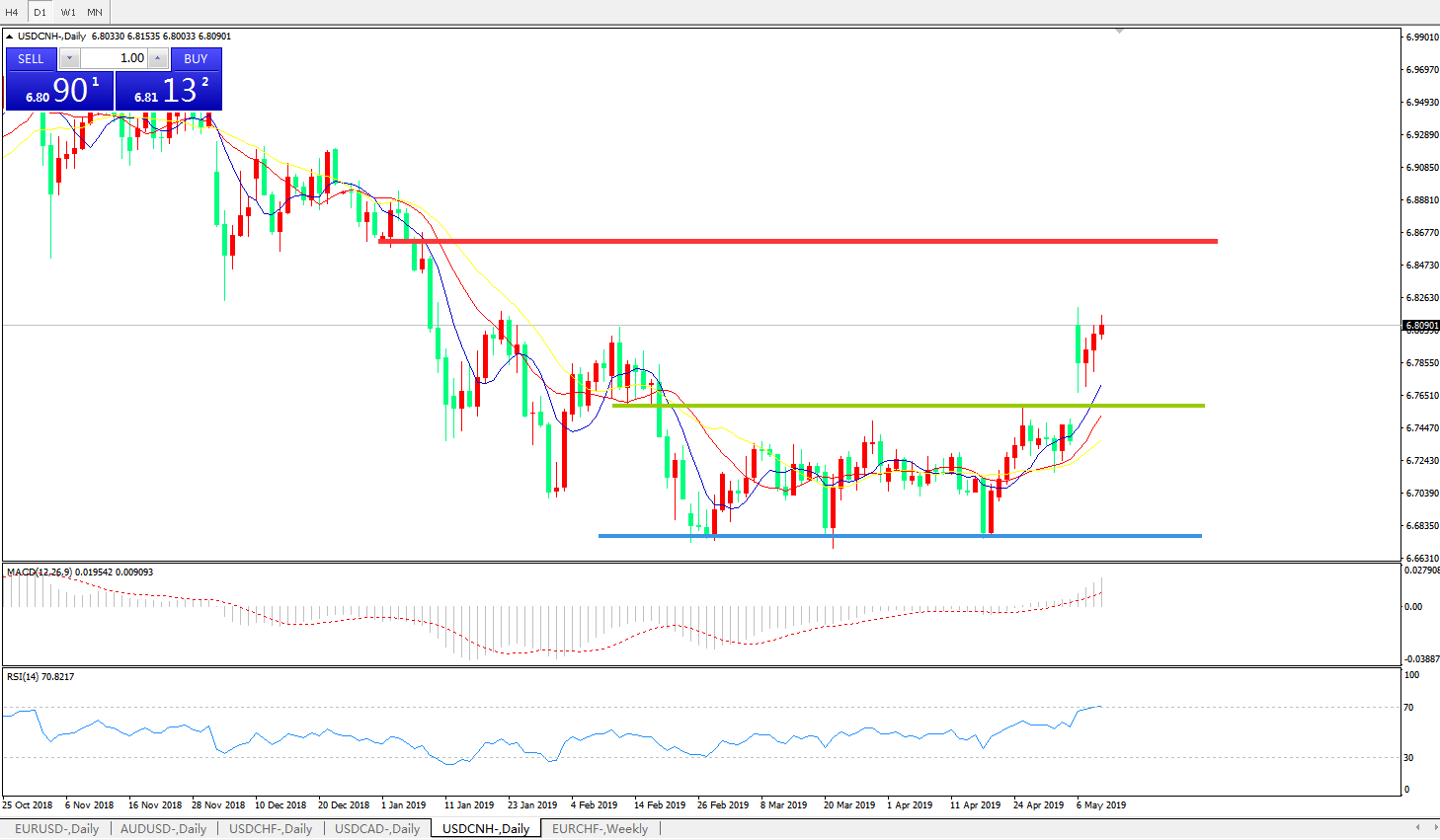 交易策略6.7560之上,看涨,目标价位为6.8585,然后为6.9200