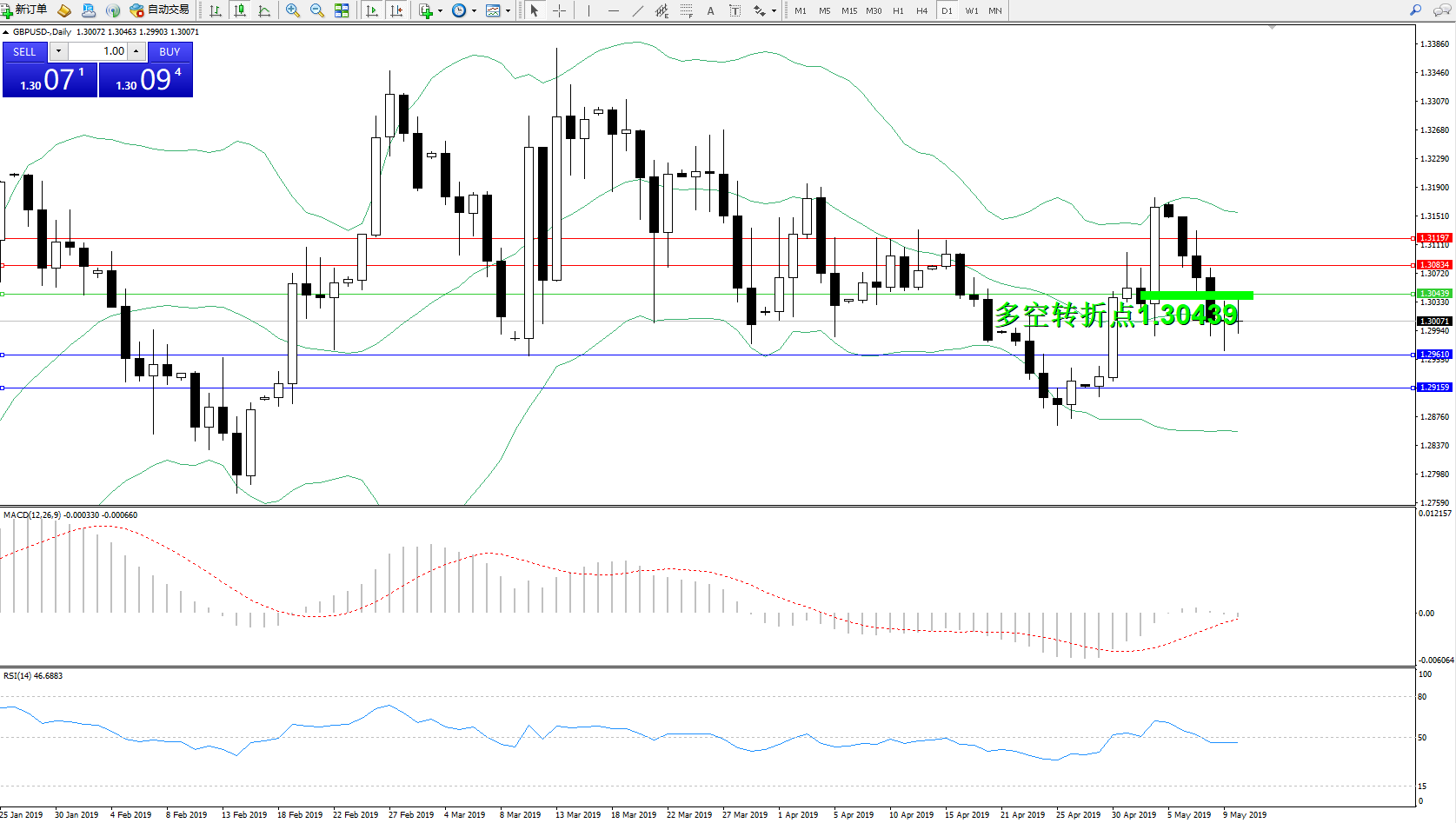 交易策略:1.30439下方看跌,目标1.296101.29159