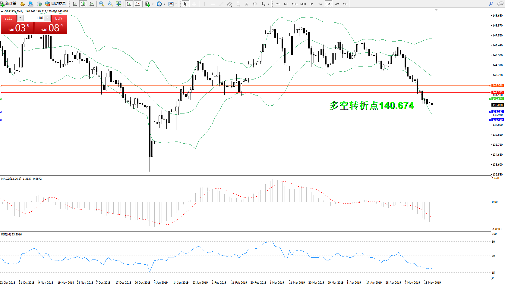 交易策略:140.674下方看跌,目标139.283、138.410