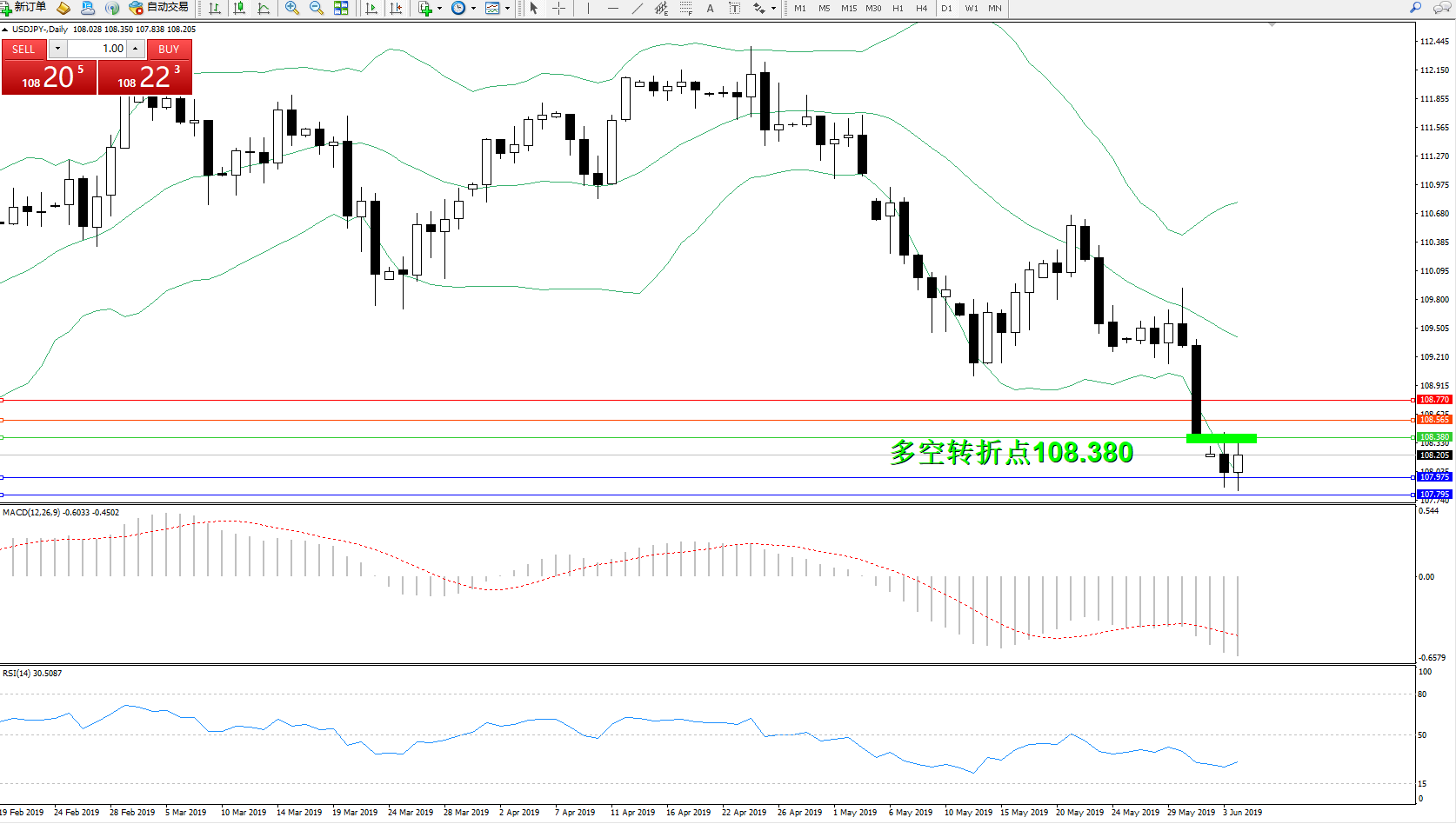 交易策略:108.380下方看跌,目标107.975、107.795