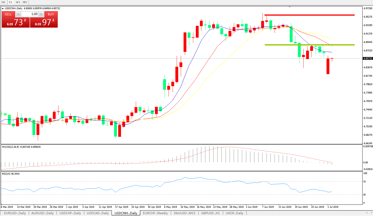 技术面简析:日线图呈有序空头排列,MACD下穿0轴且动能柱持续放量,RSI逐步走低,预计汇价大概率将进一步走低,警惕贸易谈判可能出现的反复。