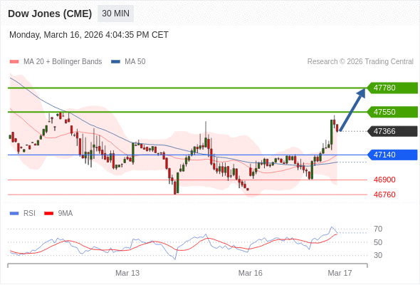 在 47140 之上,看涨,目标价位为 47550 ,然后为 47780 。