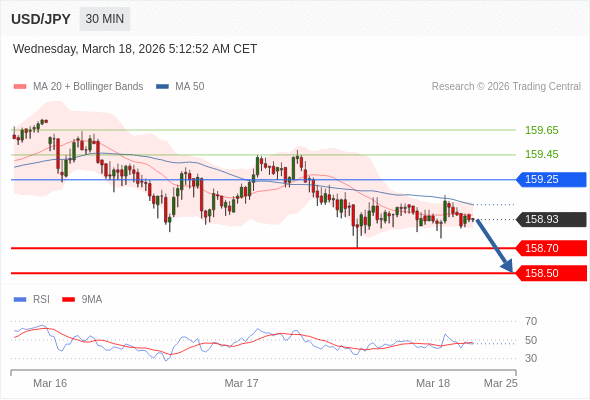 在 159.25 之下,看跌,目标价位为 158.70 ,然后为 158.50 。