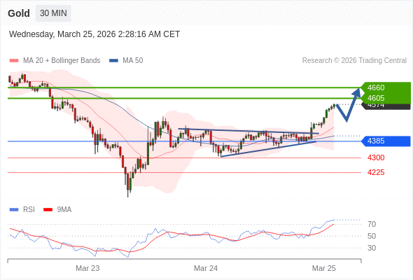 在 4385 之上,看涨,目标价位为 4605 ,然后为 4660 。