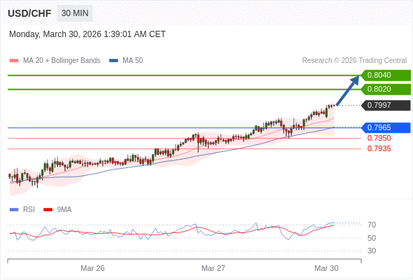 在 0.7965 之上,看涨,目标价位为 0.8020 ,然后为 0.8040 。