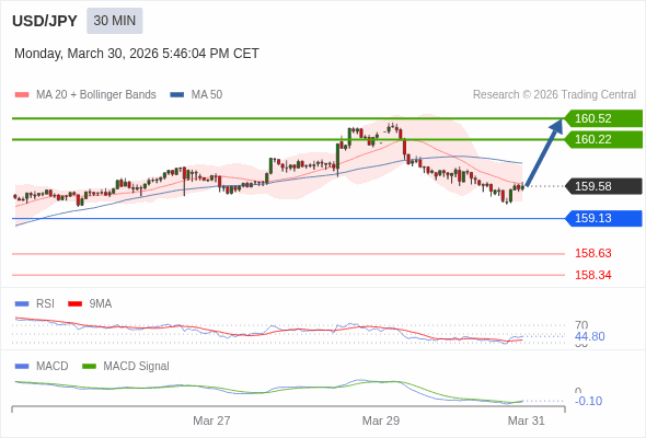 美元/日元 当日内 : 有上涨的可能,目标价位定在 160.52 。