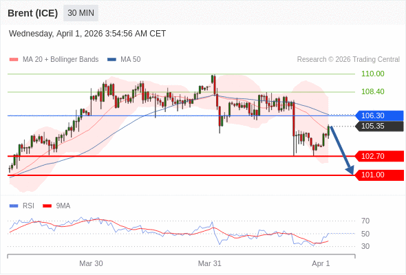 在 106.30 之下,看跌,目标价位为 102.70 ,然后为 101.00 。