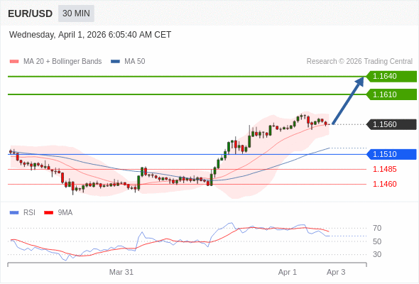 在 1.1510 之上,看涨,目标价位为 1.1610 ,然后为 1.1640 。