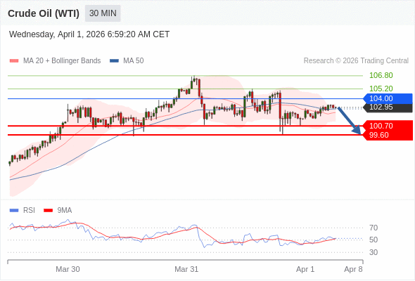 交易策略: 在 104.00 之下,看跌,目标价位为 100.70 ,然后为 99.60 。
