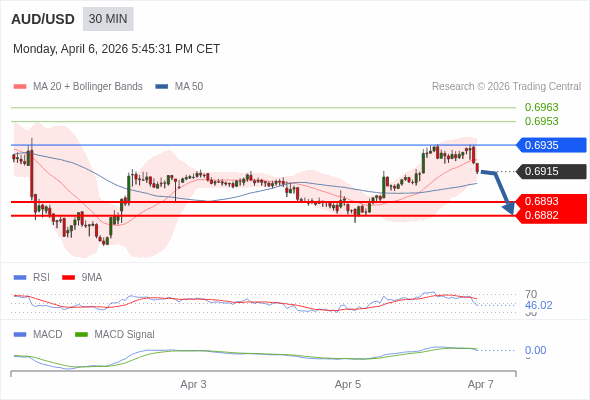澳元/美元 当日内 : 逐渐下跌,当 0.6935 阻碍上行,则 0.6882 为目标位。