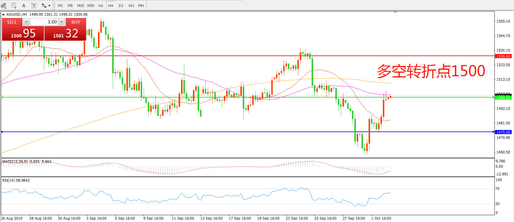 周二(10月2日),ADP公布的就业报告显示,美国9月民间就业岗位增幅低于预期,直指就业市场放缓,引发经济增长担忧,而周二公布的数据显示全球最大经济体美国的制造业活动萎缩。供应管理协会(ISM)报告显示,美国9月制造业指数降至逾10年来最低。疲弱的美国经济数据导致美指下行,金价自低位反弹,收复千五关口,收报1500.60美元/盎司。