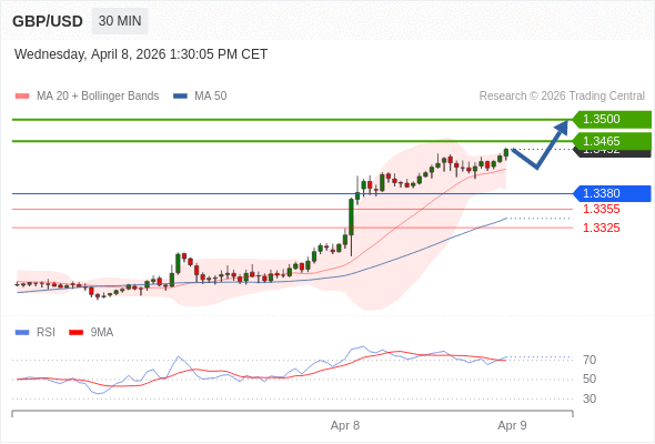 在 1.3380 之上,看涨,目标价位为 1.3465 ,然后为 1.3500 。