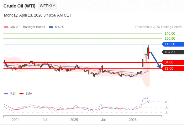 交易策略: 在 119.50 之下,看跌,目标价位为 84.00 ,然后为 72.00 。
