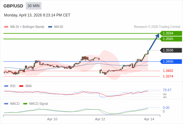 技术点评: RSI技术指标大于70。在这种情况下,说明有很强的上升趋势,或者意味着处在超买的状态下,可能会有向下的调整。我们将观察RSI技术指标是否出现背离现象。 MACD技术指标处在其信号线之上看多。 配置为正。 此外,价位高于其20天及50天移动平均线 ( 分别位于1.3454 和1.3432 )。 最后,价位突破其布林线通道上轨 (位于1.3504。
