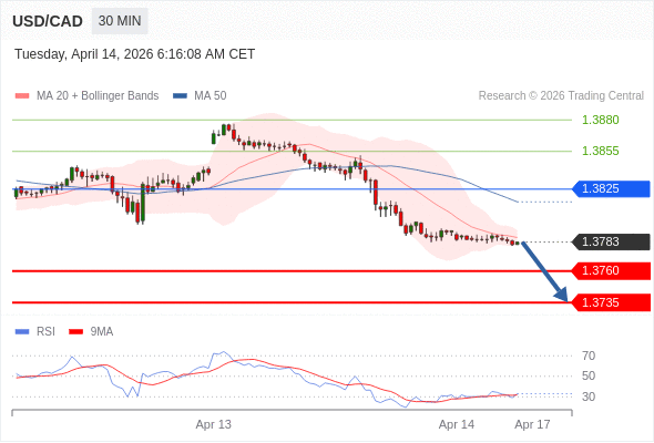 在 1.3825 之下,看跌,目标价位为 1.3760 ,然后为 1.3735 。