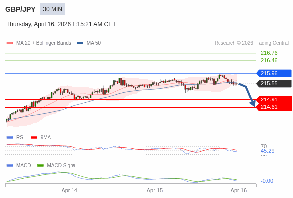 英镑/日元 当日内 : 看跌,在 215.96 之下。