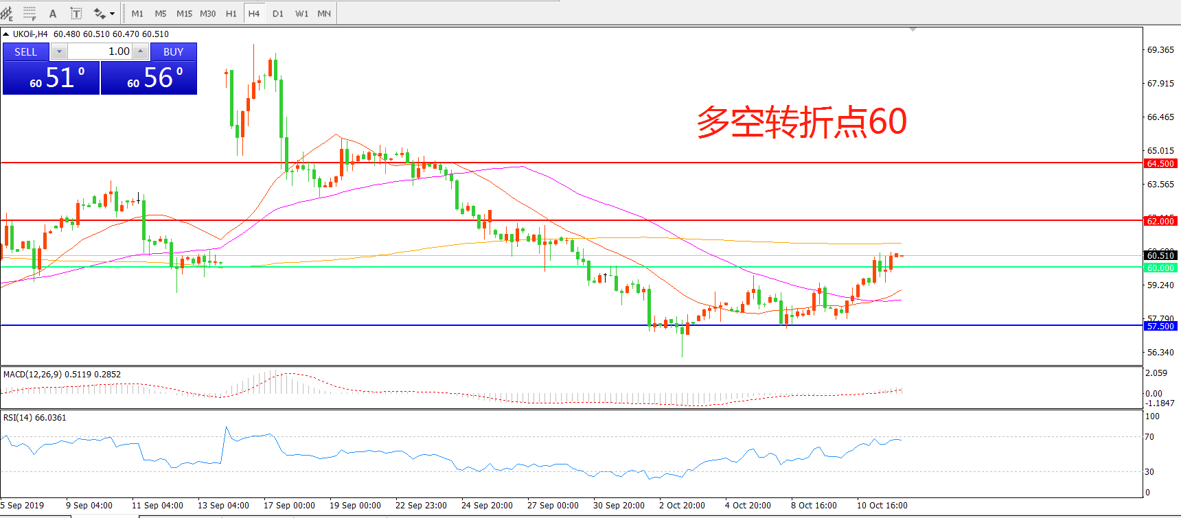 4小时图看,油价企稳后震荡反弹,60美金一线被突破,整体走势有所回暖,MACD红柱增加,RSI指标向上,日内延续上行概率较大。