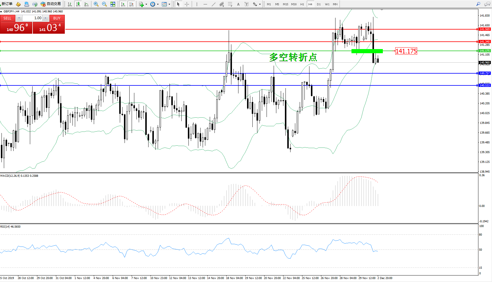 交易策略:141.175下方看跌,目标140.757、140.533