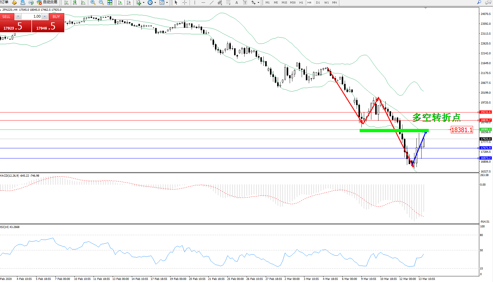 日经指数JPN225——4小时K线图显示: