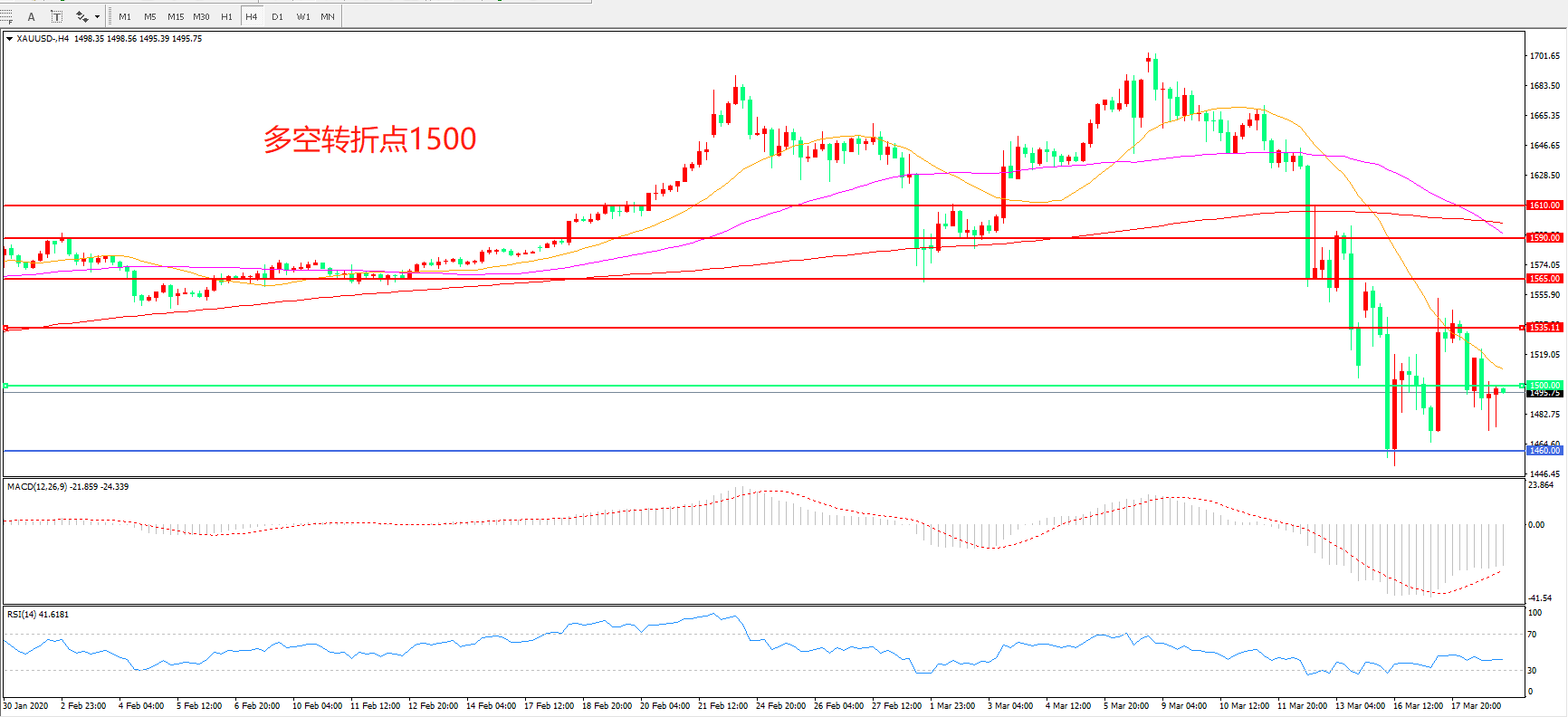 交易策略: 在 1500.00之下看跌,目标1460.00 1400.00