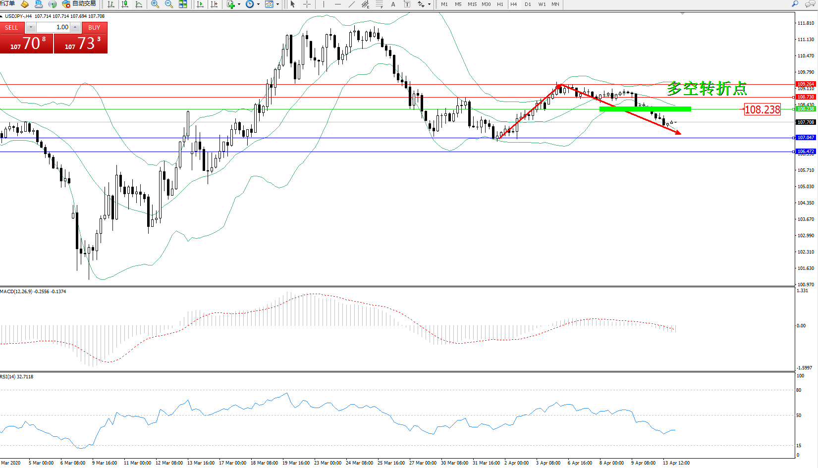 交易策略:108.238下方看跌,目标107.047106.472