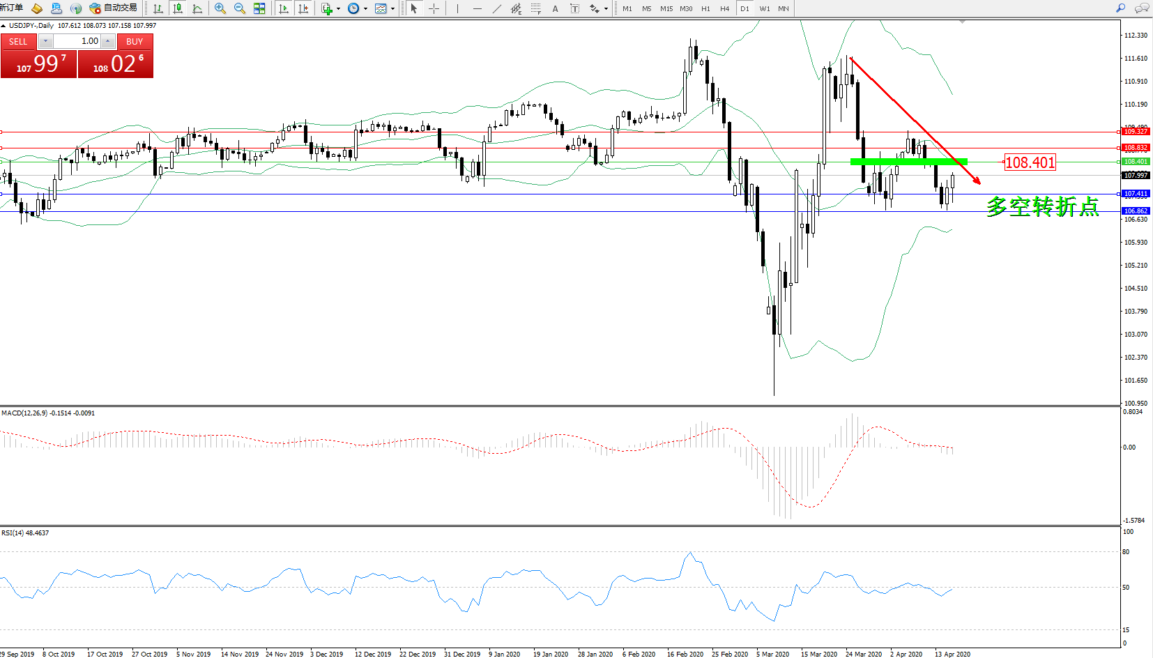 交易策略:108.401下方看跌,目标107.411106..862