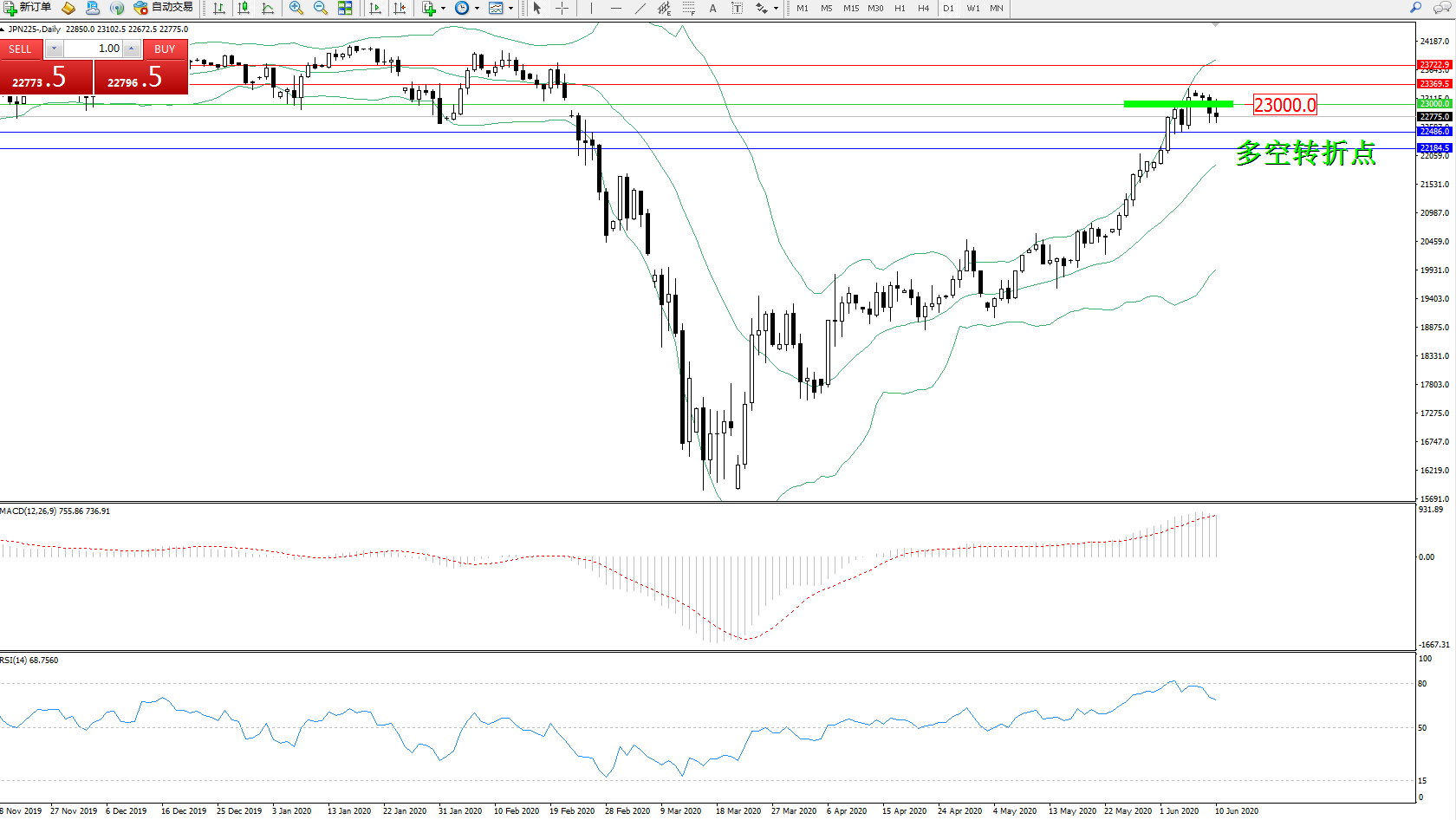 技术点评:多头动力长期延续布林带指标上轨不断上行,高位出现短期遇阻态势,空头动力伺机入场,开始有转势下行迹象,布林带指标呈张口走势后,开始有缓慢收口迹象,MACD指标处于0轴线上方多头区域高位平缓上扬后有下行迹象,RSI指标处于50均衡线上方多头区域持续平缓上移至80均衡线超买区位置整理遇阻回撤;