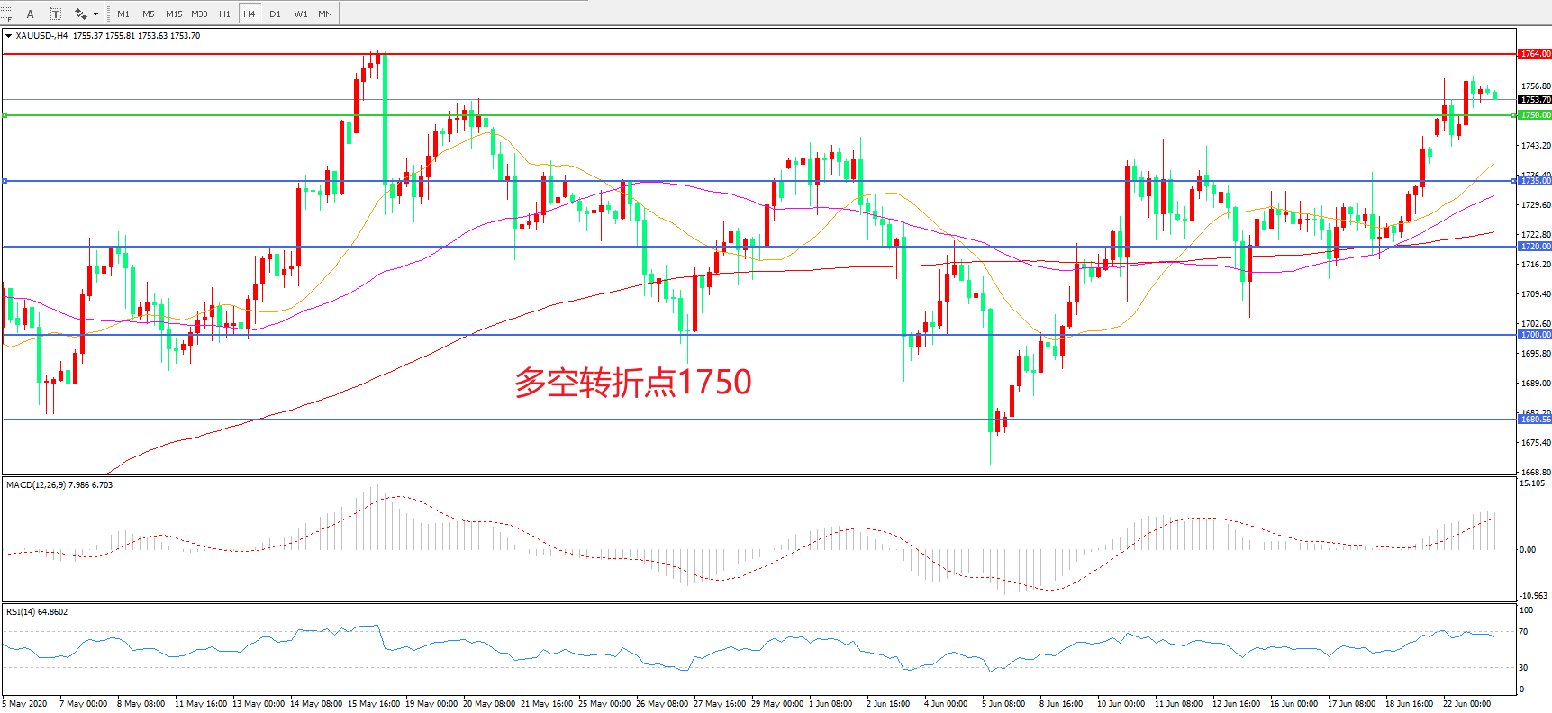 交易策略:在1750.00之上看涨,目标1764.00   1780.00