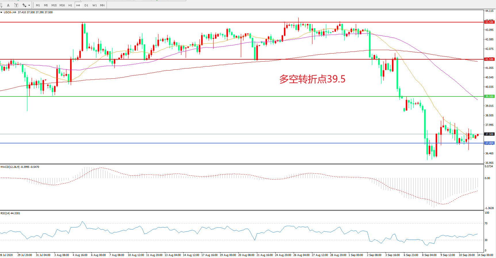 交易策略: 在39.50之下看跌,目标37.00 35.00