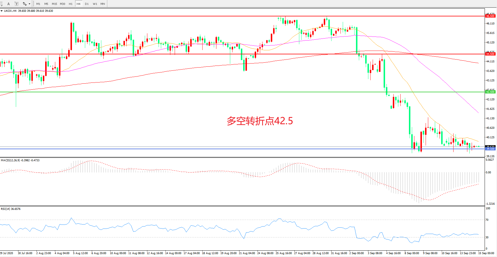 交易策略: 在42.50之下看跌,目标39.50 37.00