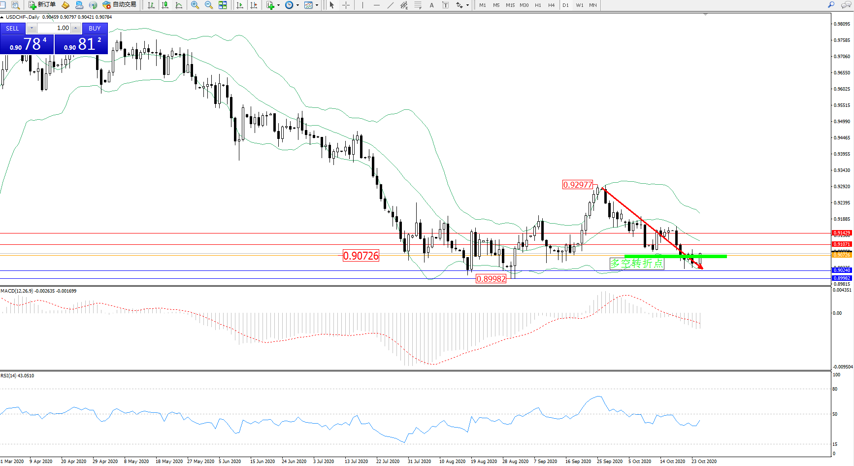 交易策略:0.90726上方看涨,目标0.91071、0.91429