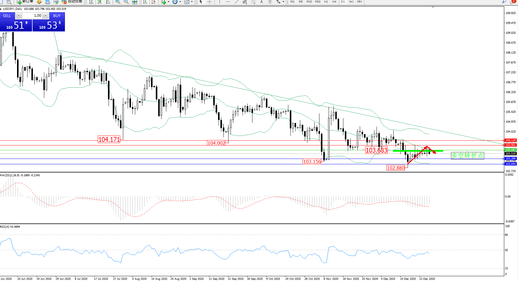 交易策略:103.683下方看跌,目标103.289、103.044