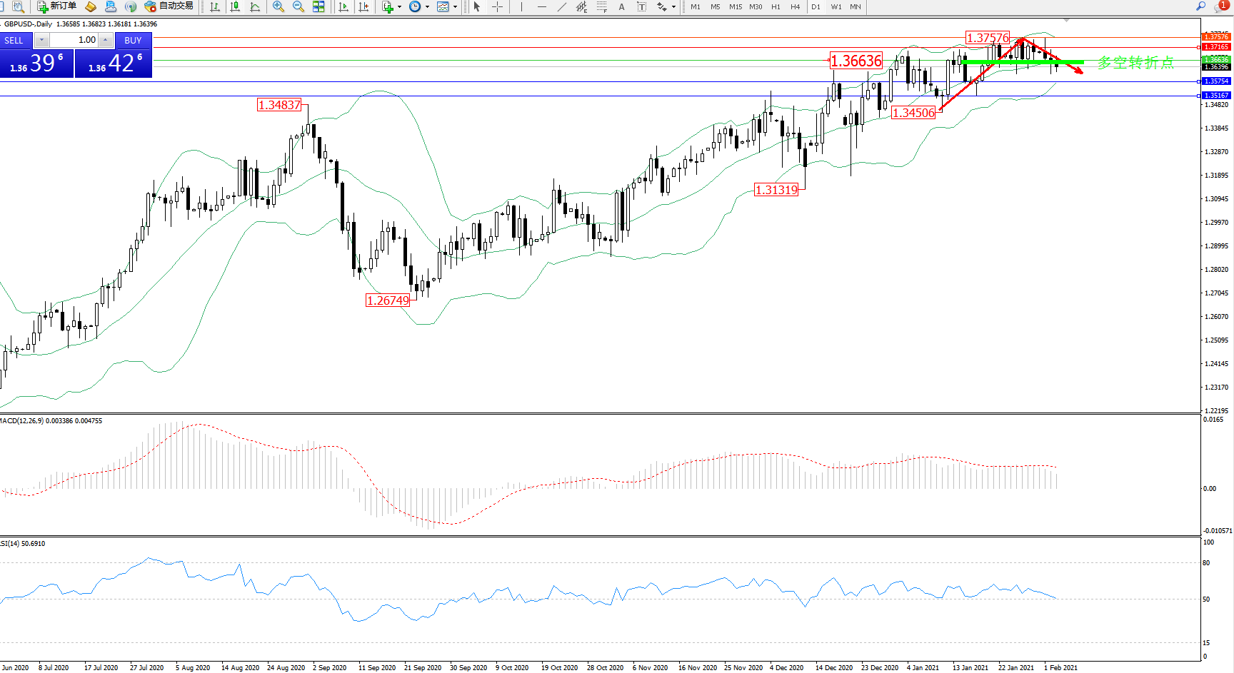 交易策略:1.36636下方看跌,目标 1.35754、1.35167