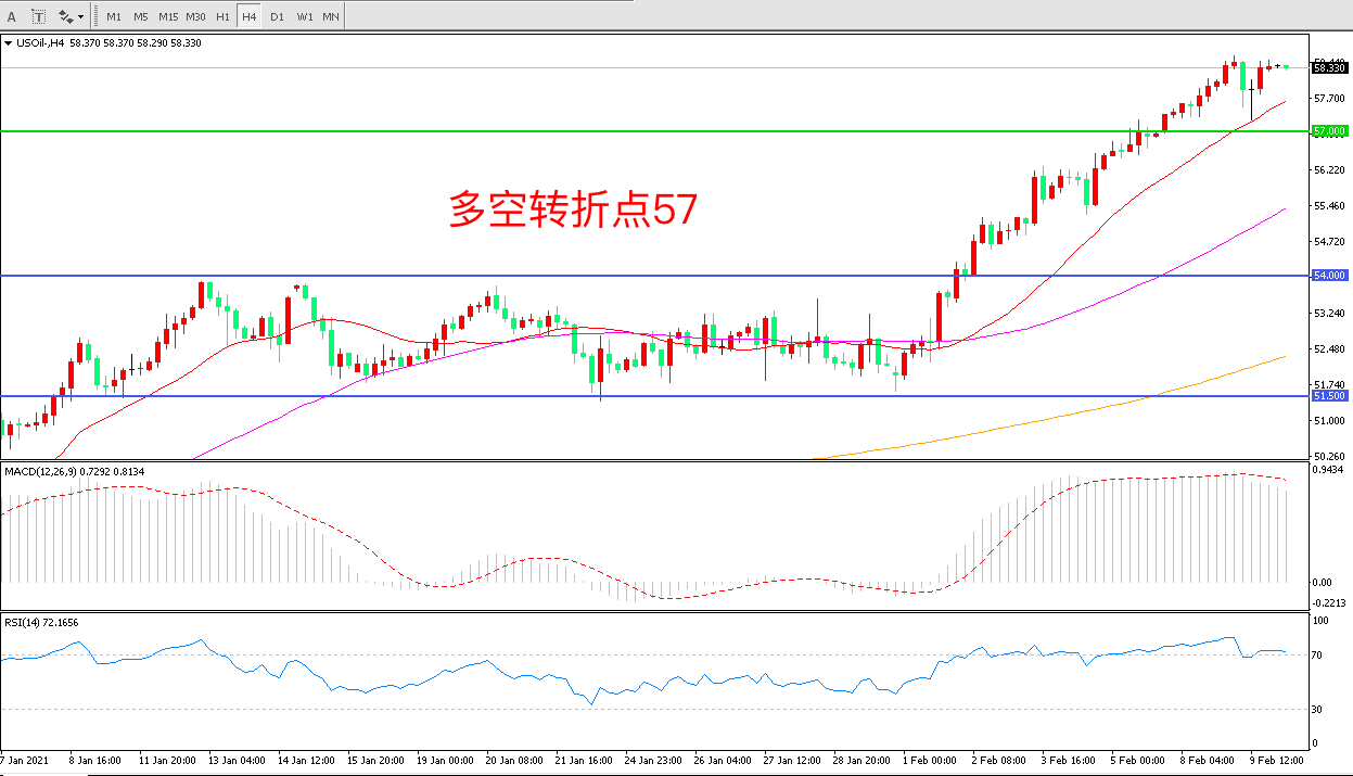 4小时图看,油价连续拉升,整体表现偏强,57阻力被快速突破后,多头趋势已经形成,MACD红柱增加,RSI指标走平,日内延续上行概率较大。