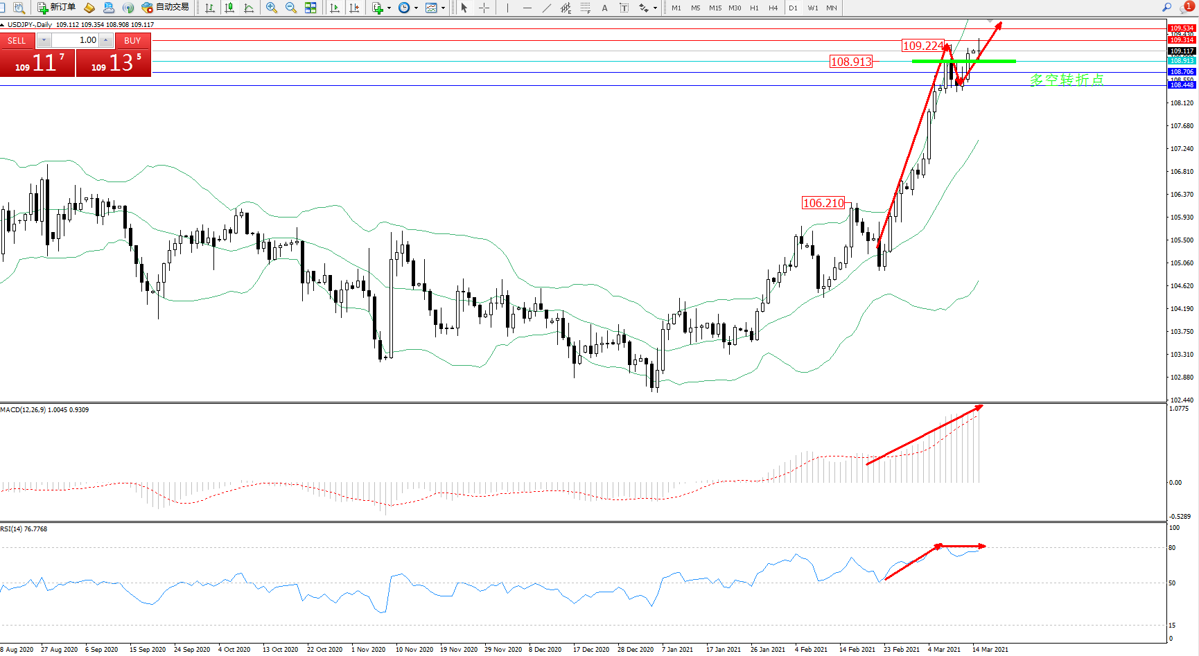 技术点评:多头动力延续布林带指标通道上轨附近节点持续震荡上扬,高位纠结于109.224附近节点后持续有拉升上行态势,之前高位破位后维持震荡,布林带指标呈张口走势后不断有上移迹象,且有收口态势,MACD指标处于多头区域高位不断震荡上移,RSI指标处于80均衡线下侧弱势徘徊中;