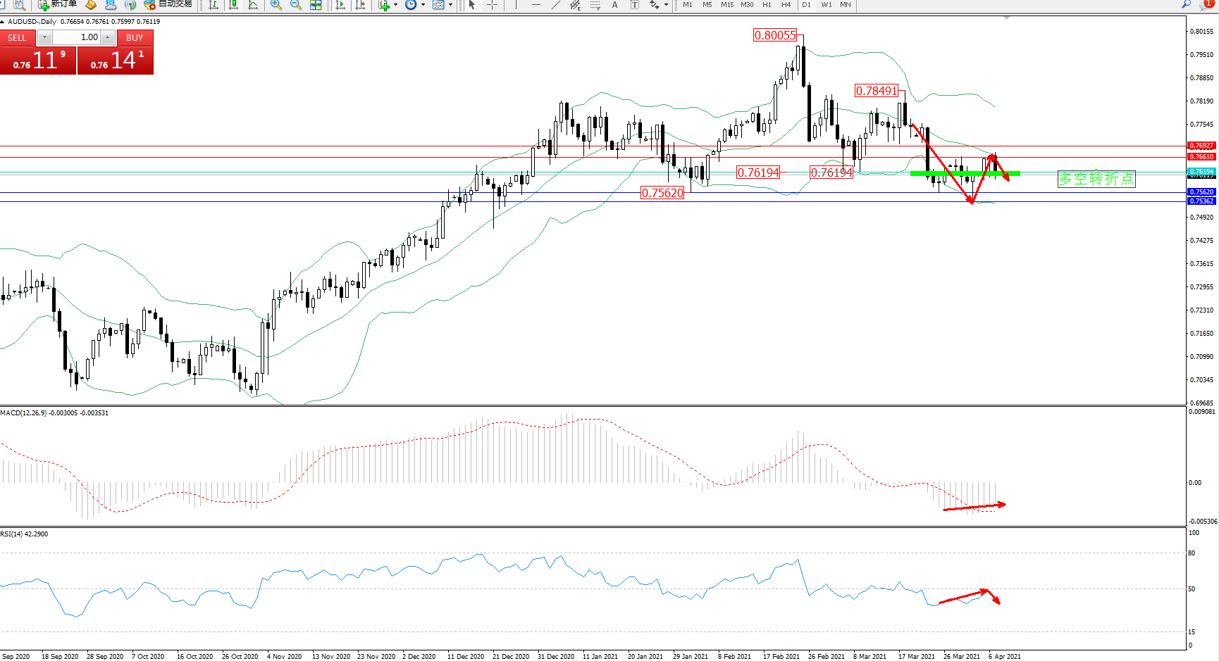 备选策略:0.76194上方看涨,目标0.76610、0.76927