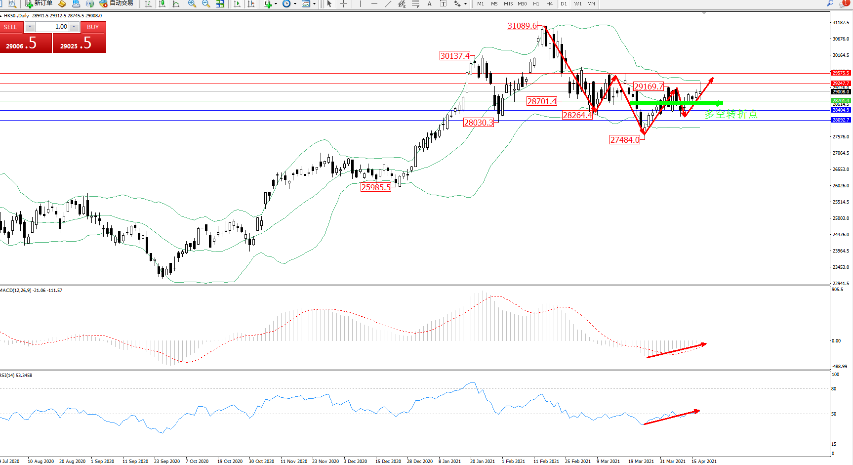 技术点评:空头动力延续布林带指标通道中下轨区间持续下行后,低位抵达27484附近得到支撑反转上移,纠结于布林带指标中轨附近持续震荡后有上移迹象,布林带指标呈收口走势后开始平移,关注中轨附近节点,MACD指标处于0轴线下方空头区域维持整理缓慢上移,RSI指标处于50均衡线附近弱势徘徊中;