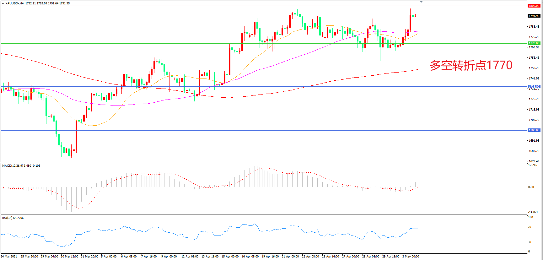 交易策略:在1770.00之上看涨,目标1800.00    1840.00