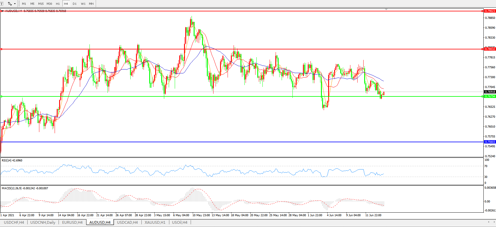 技术面简析:4小时图均线发散下行,汇价大跌后小幅反弹,MACD下穿0轴且量能微放量,RSI呈中性,预计短期汇价大概率将在反弹整理后进一步下行。