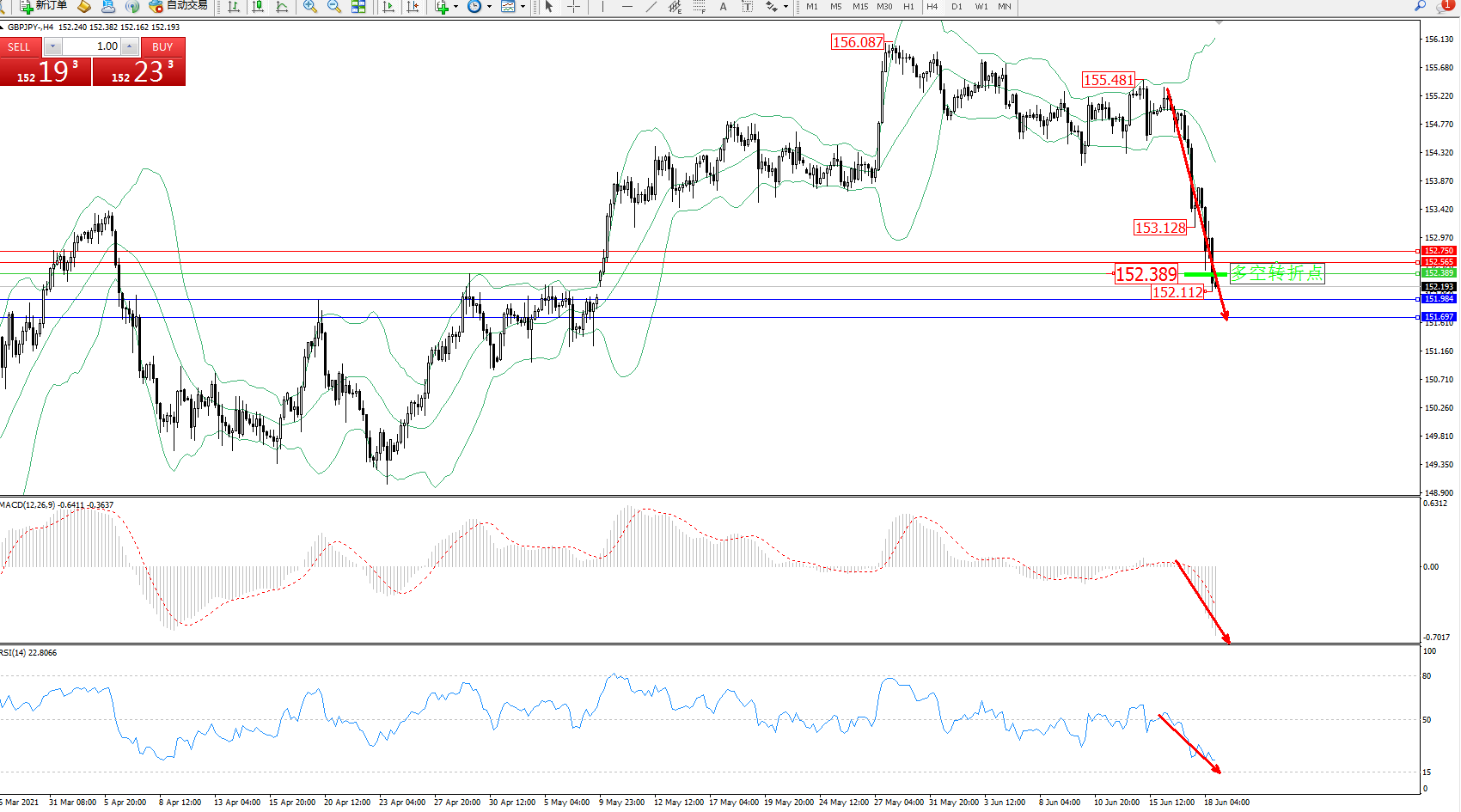 技术点评:高位空头动力延续布林带指标通道下轨附近强势下挫,跌破下轨后不断向下移动中,抵达152.112附近开始整理,但下行趋势态势良好,跌势未能有止步迹象,布林带指标呈张口走势持续中,MACD指标处于0轴线下方空头区域不断向下移动,RSI指标处于50均衡线下方空头区域维持震荡下挫中;