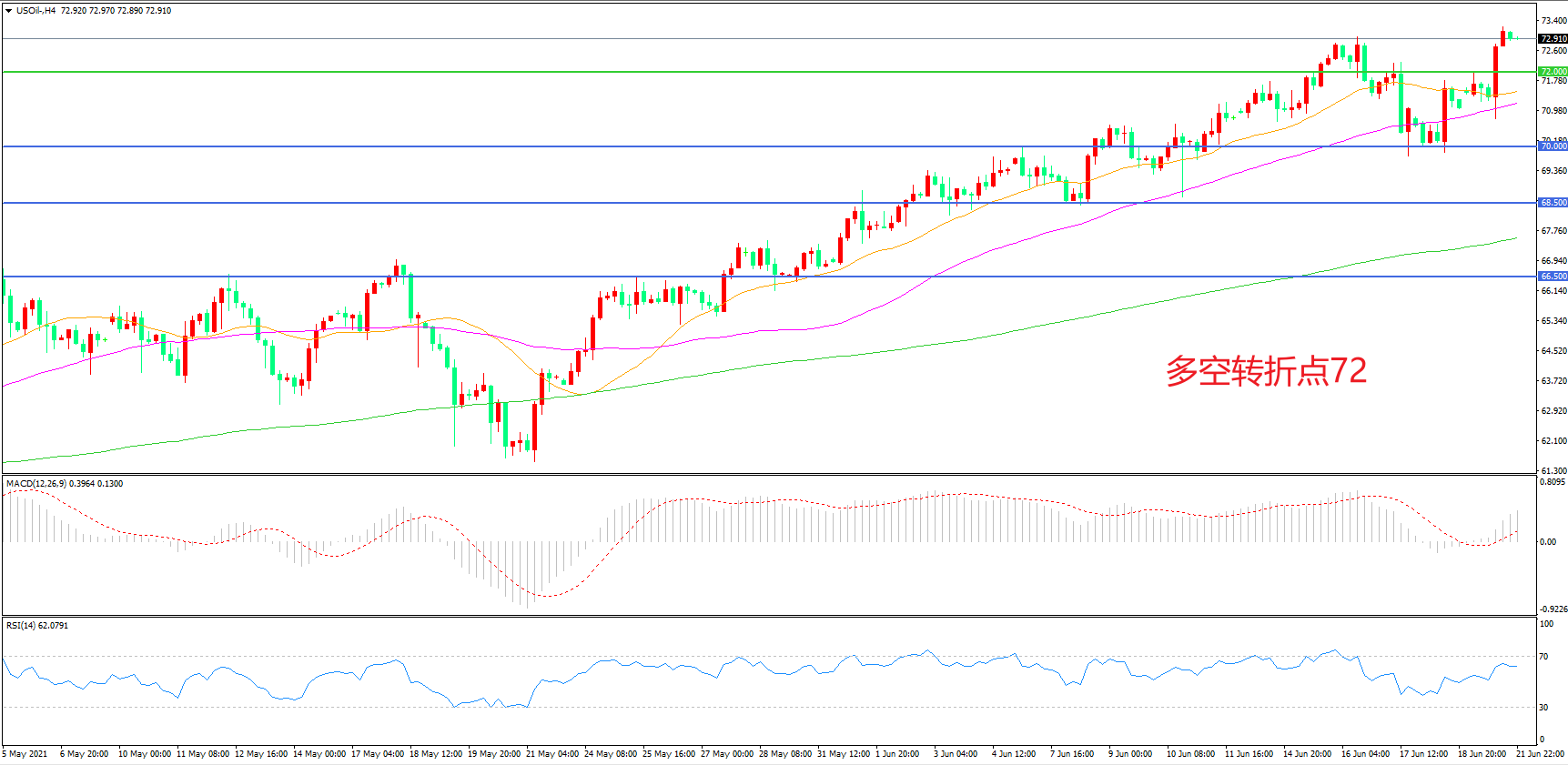 周一(6月21日),在赢得伊朗总统大选后的首次新闻发布会上,易卜拉欣•莱希亮出了强硬的立场,排除同美国总统拜登会晤的可能性,油市多头欢欣鼓舞,美国WTI原油再度拉升,收报72.95美元/桶。从现在的情况看,伊核协议谈判仍然存在“重大分歧”,在原油所持供不应求的背景下,市场下半年的上涨行情依然值得期待。
