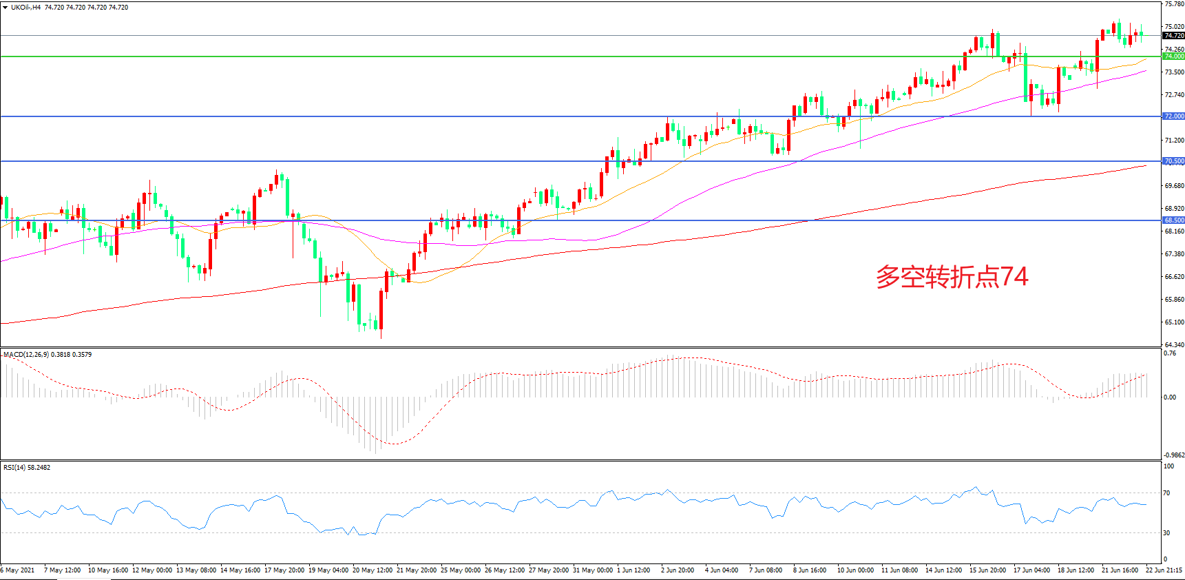 4小时图看,油价长阳拉升,强势突破74美元阻力,短期表现强势,均线系统成为下方支撑,MACD红柱增加,RSI指标走平,日内震荡上行概率较大。