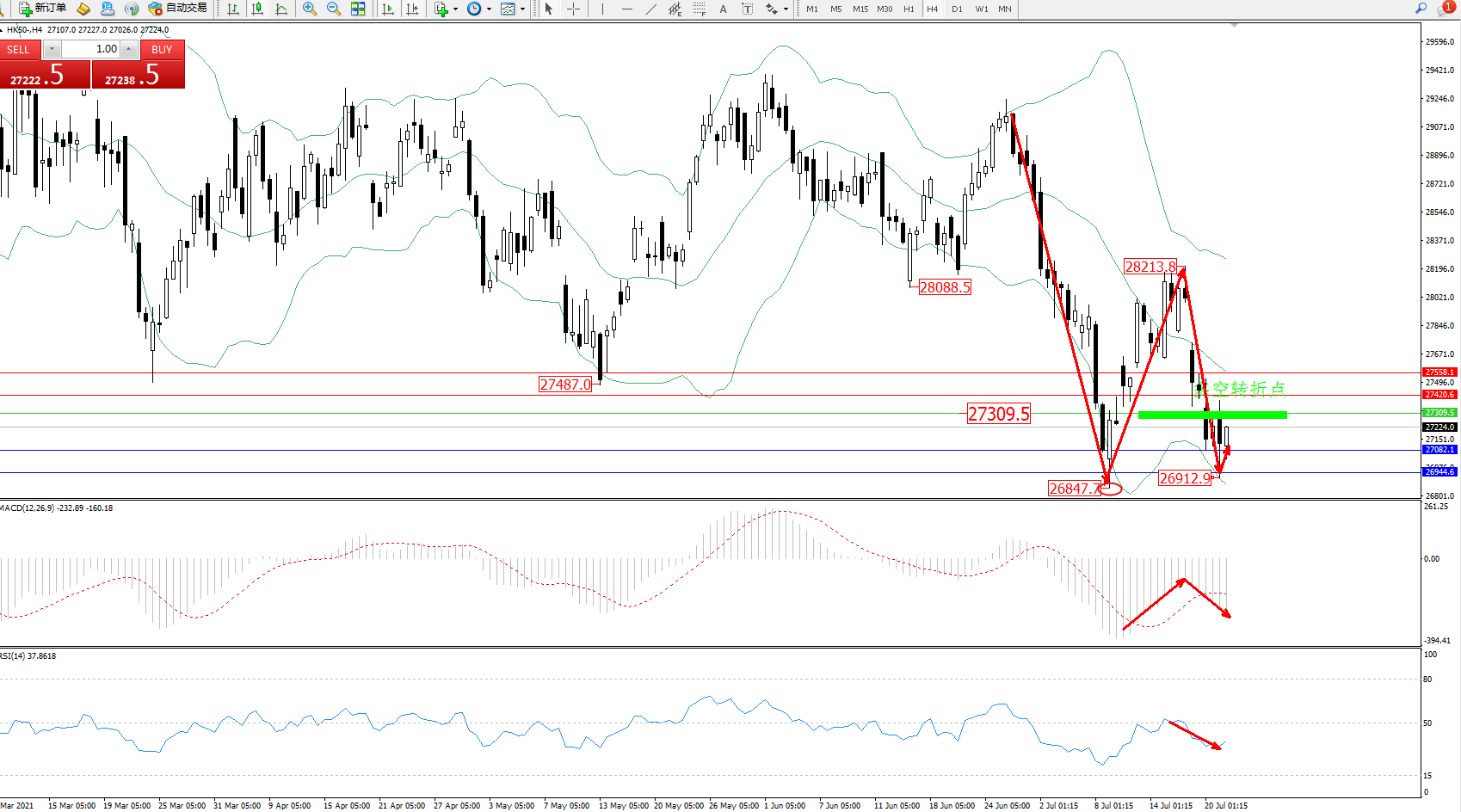 恒指HK50 ——4小时K线图显示: