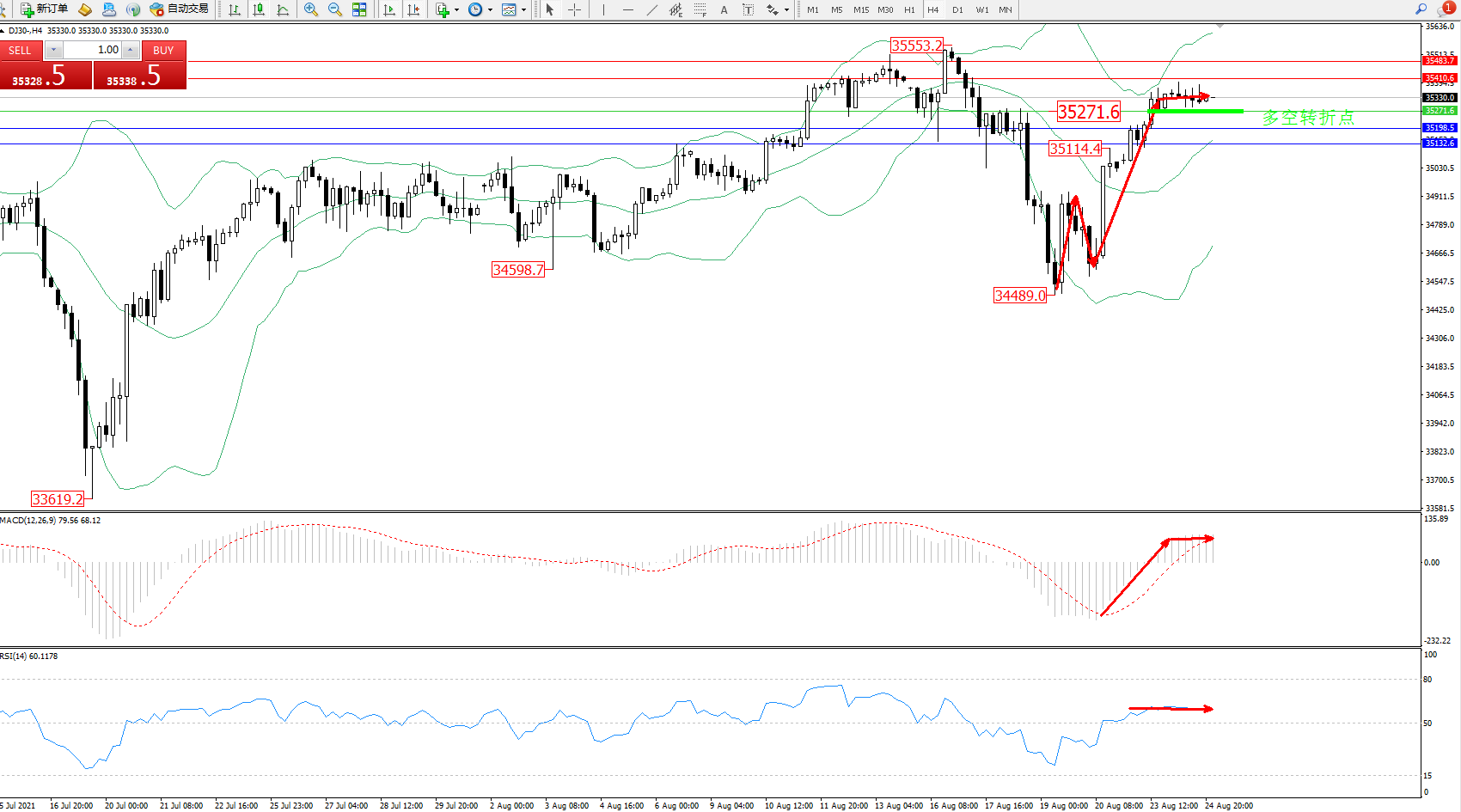 技术点评:多头动力强势拉升上扬,高位触及布林带指标上轨附近节点后开始窄幅整理平移,多头动力短期出现疲软,布林带指标呈收口走势后开始向上拉升中,MACD指标处于多头区域高位整理平移中,RSI指标纠结于50均衡线上方弱势平移中;