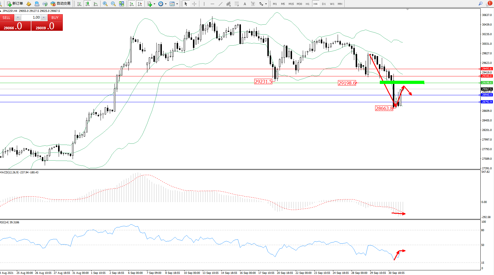 日经指数JPN225——4小时K线图显示: