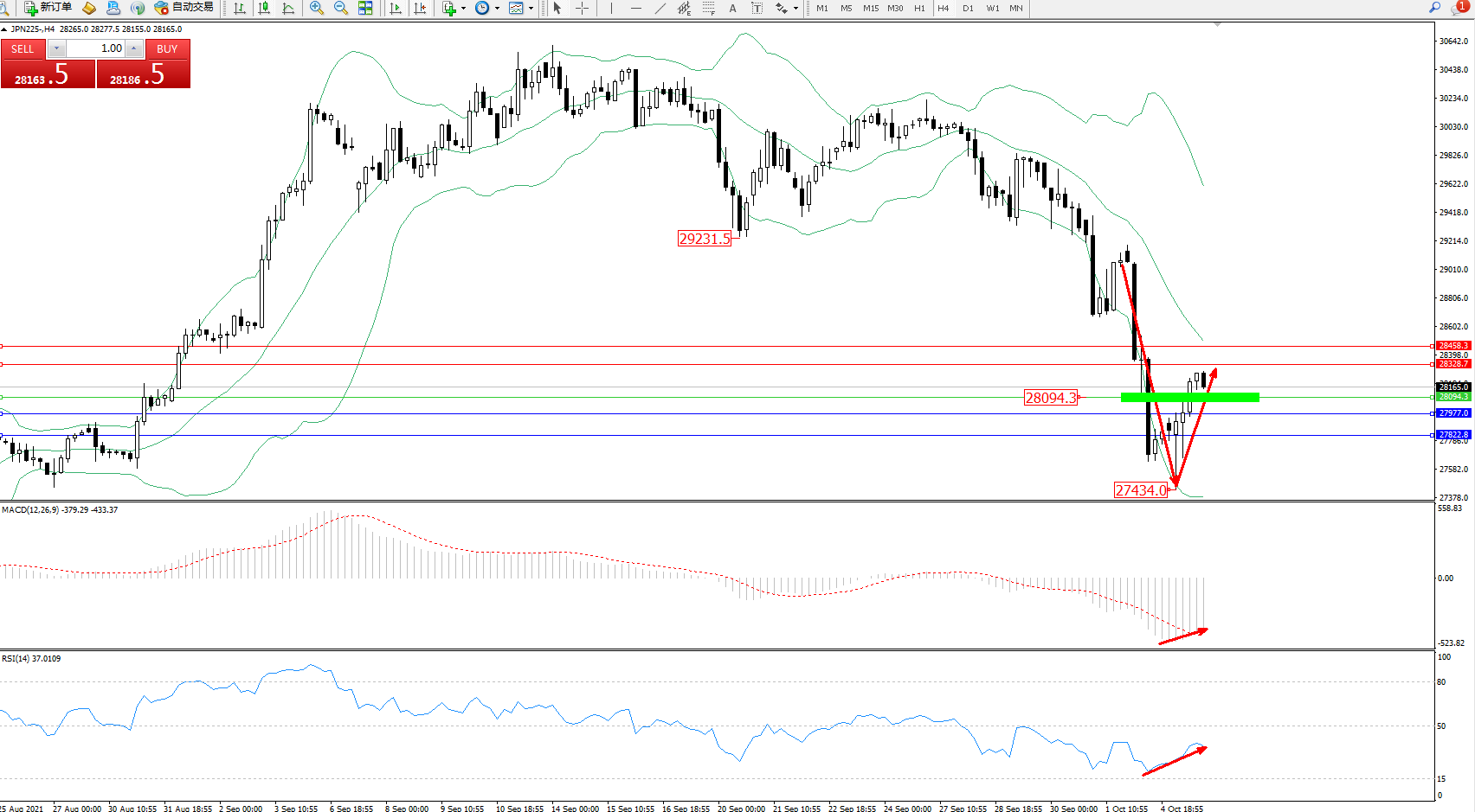 日经指数JPN225——4小时K线图显示: