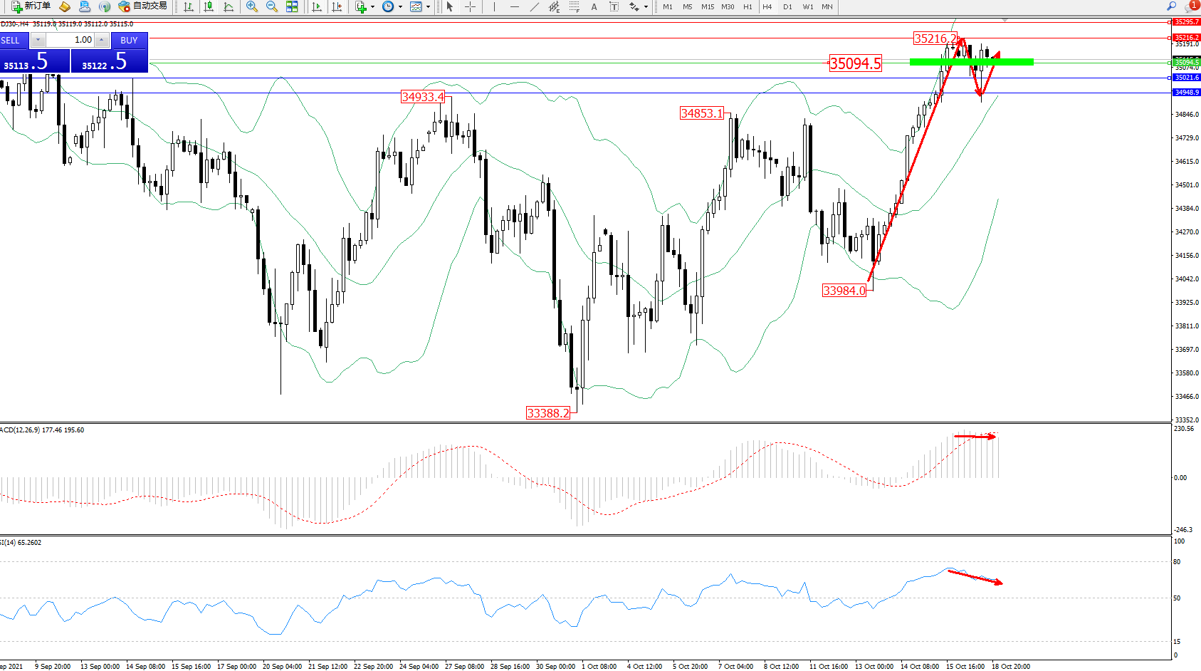 道琼斯指数DJ30——4小时K线图显示: