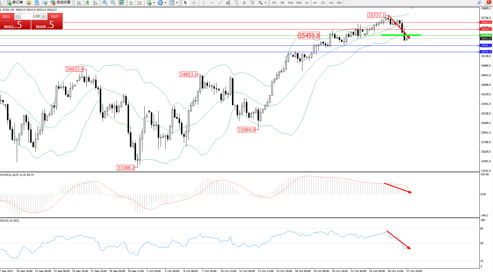 道琼斯指数DJ30——4小时K线图显示: