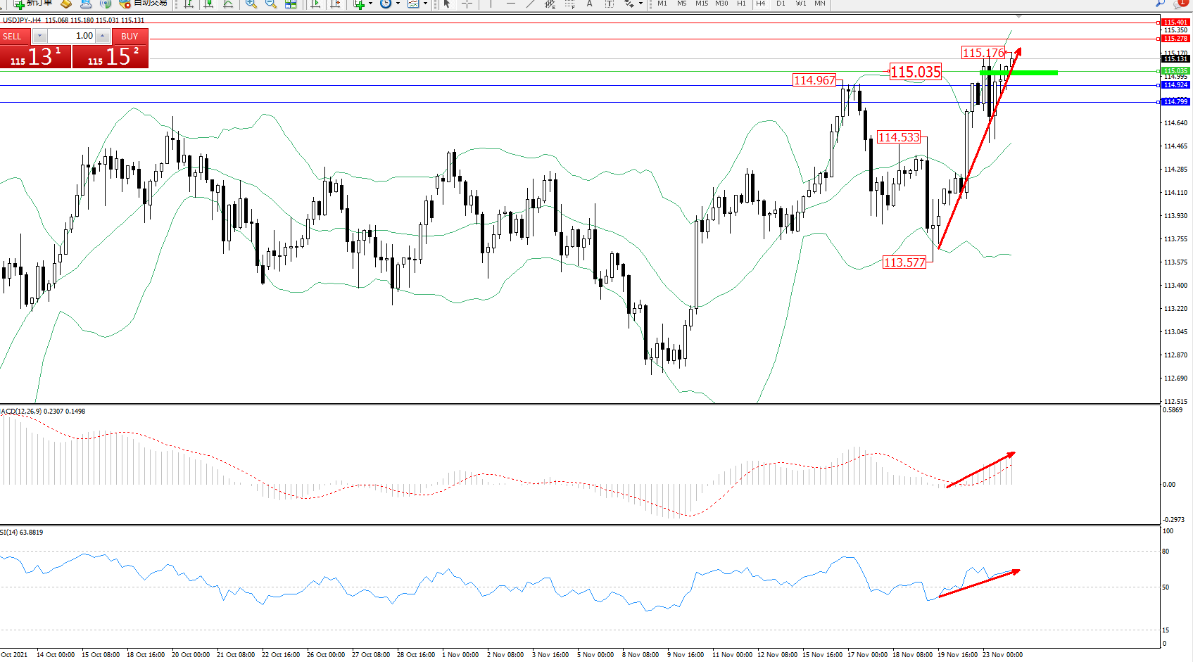 技术点评:多头动力延续布林带指标中上轨区间持续震荡上扬,高位抵达115.176附近开始震荡,多头动力有继续攀升态势,布林带指标呈张口走势态势良好,短期多头尚未有止步迹象,MACD指标处于多头区域维持整理上移,RSI指标处于多头区域持续平移中;